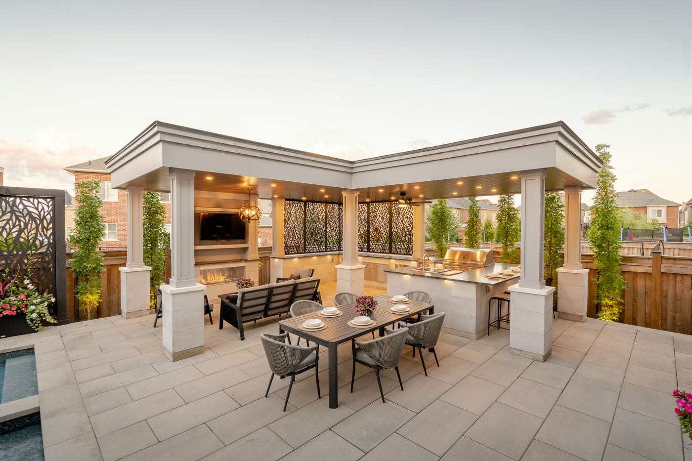 You would commonly find cabanas and pergolas in both traditional and modern backyards of high-end homes. A cabana is a small hut built for a specific purpose, usually for a dining or lounging area. They might also be fixed with additional features, like curtains for extra privacy. This can make for a handy changing room next to a swimming pool, for example.